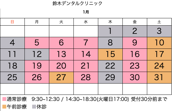 1月休診日のお知らせ 2025年12月17日 お知らせ 2026年もどうぞよろしくお願い致します。年始は5日(月)から診療が始まります。また、今月の午前診療は、15日(木)、27日(火)、毎週土曜日となります。ご予約お待ちしております。