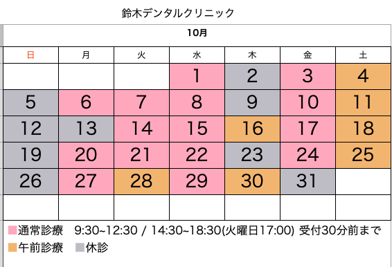 10月は16日(木)、28日(火)、30日(木)、毎週土曜が午前診療となります。
