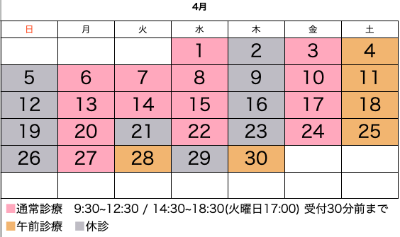 4月は祝日・歯科健診があるため、21日(火)は休診28日(火)30日(木)は午前診療となります。